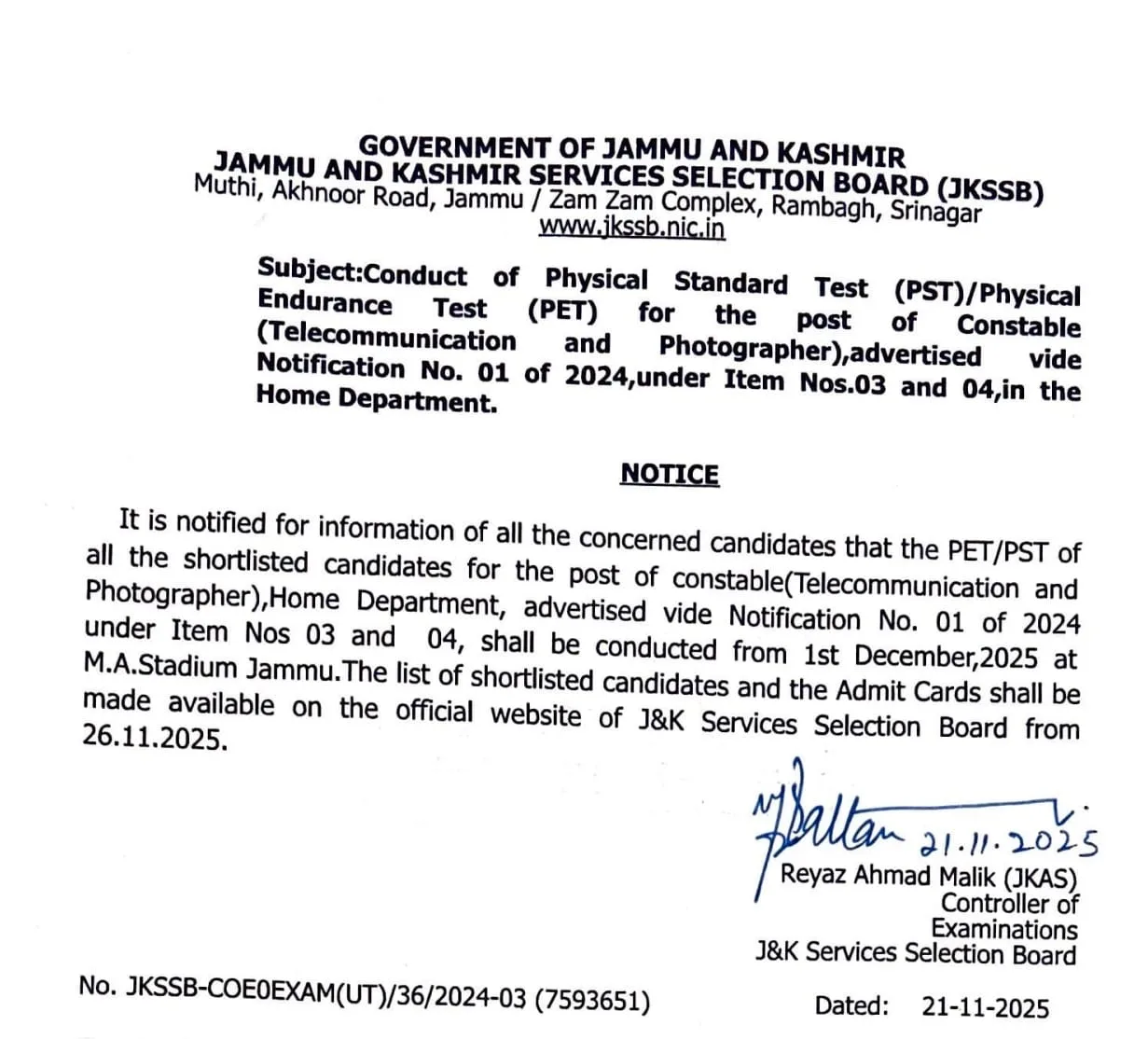 The Jammu and Kashmir Services Selection Board – JKSSB has published an important notification PDF for Physical Standard Test (PST) and Physical Endurance Test (PET) for the recruitment of Constable (Telecommunication) and Constable (Photographer) vacancies that are under the Home Department. These posts were originally advertised under Notification No. 01 of 2024 Item Nos. 03 and 04.